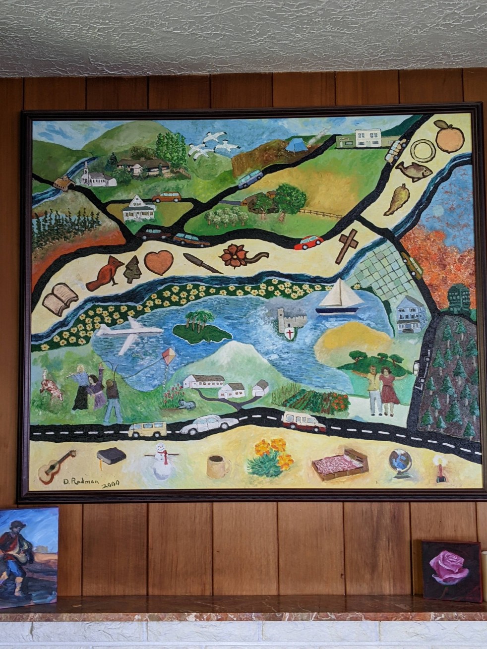 About thirty years later, he felt a release to paint again. His first paintings were gifts to our now grown children. Rosanna received a beloved beach scene. Elizabeth, a special painting he took from a photo taken on Mt. Baker, and our son received an interpretation of a space galaxy. They hang in their homes to this day. I whine, “where is mine?” I want one! Finally, in 2000, I received a huge, amazing painting of our life together. He put in every car we owned, every house we lived in and through symbolism, every part on the globe we ministered in together. Our children are represented, as well as our pets. It is truly a tribute of our life together. I am so grateful to have this reminder of God’s faithfulness. It is only one of my reminders (memorial stones) of His work in our lives.